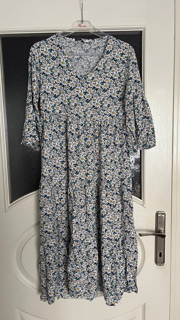 Çiçek desenli, bol kesim uzun elbise. V yaka, kısa kollu ve fırfır detaylı bohem tarzda, yumuşak sentetik kumaştan yapılmıştır.
