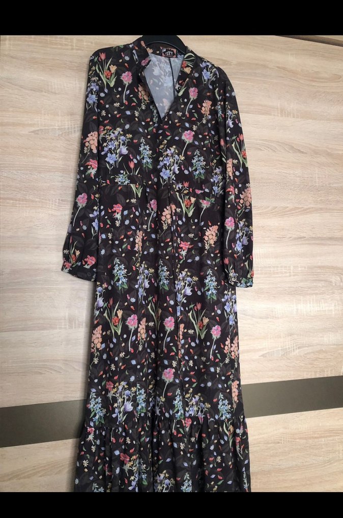 Uzun, bol kesim bohem elbise, koyu renkli çiçek desenli ve yumuşak sentetik kumaştan. Uzun kollu, V yaka ve düğmeli detaylara sahip.
