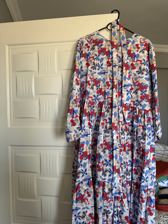 Uzun, bol kesim elbise, yakalı ve uzun kolludur. Hafif renklerde canlı tie-dye çiçek desenine sahiptir, bohem tarzı için uygundur.