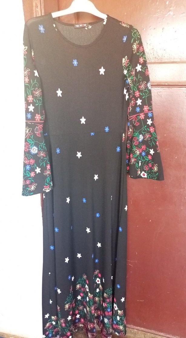 Uzun, bol kesim bohem elbise, bisiklet yaka ve uzun kollu, koyu renk sentetik kumaş üzerinde renkli çiçek desenleriyle. Drapeli tasarıma sahip, günlük kullanım için uygun.