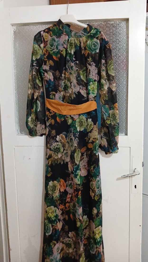 Yüksek yakalı, uzun kollu ve bol kesimli bu uzun bohem elbise, koyu renkli çiçek desenli sentetik kumaştan yapılmıştır. Belde kemer detayı vardır.