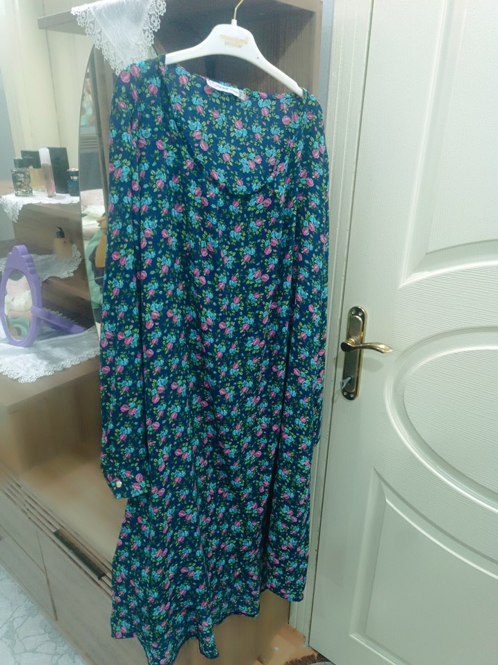 Uzun kollu, bol kesim, drapeli ve V yakalı bu elbise koyu renkli çok renkli çiçek deseni ile bohem tarzını yansıtıyor.