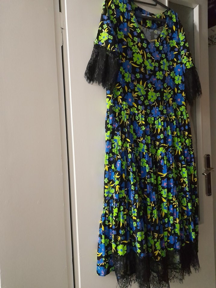 Renkli çiçek desenli, pileli detaylara sahip uzun kadın elbisesi. Bol kesim ve kollu, bohem tarzda rahat sentetik kumaş.