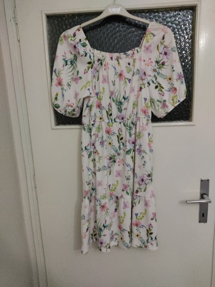 Beyaz, uzun, straplez bohem elbise, kısa kollu ve çiçek desenli, bol kesim ve fırfır detaylarıyla hafif ve rahattır üründe defo yoktur 1 kere giyildi bedeni büyük geldiği için satıyorum.
