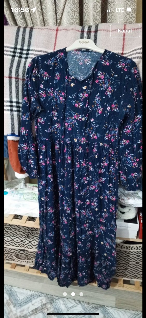 Uzun, bol kesim elbise, uzun kollu ve V yakalıdır. Yumuşak sentetik kumaştan, koyu çok renkli çiçek deseni ve fırfır detaylarıyla bohem tarzı sunar. Lacivert çok tatlı bir elbise dar olduğu için satıyorum