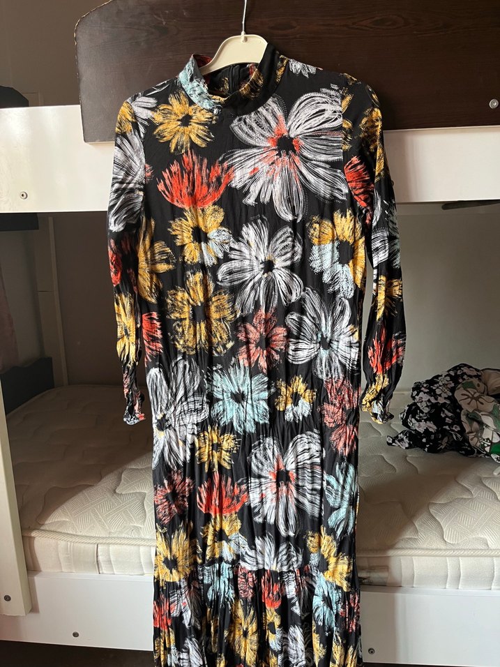 Uzun, bol kesim elbise, yüksek yakalı ve uzun kollu, pileli sentetik kumaştan. Koyu renkli, canlı çiçekli tie-dye deseniyle retro bohem tarzda.