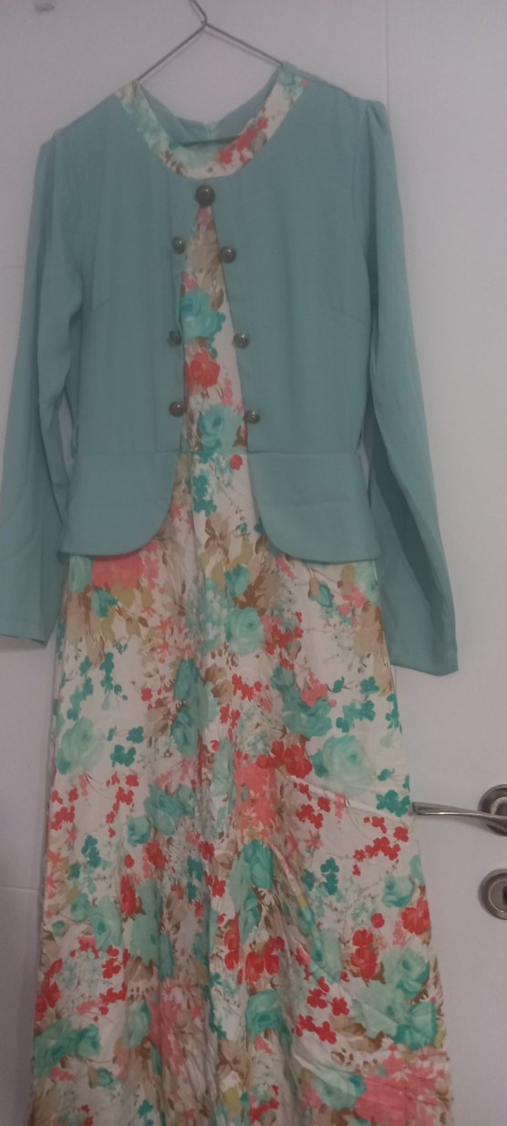 Çiçek desenli, uzun ve ceket görünümlü bitişik elbise. uzun kollu, düğmeli detaylara sahip, pastel tonlarda Ofis için uygun bohem tarzda.bi kac kere giyildi temiz sorunsuz