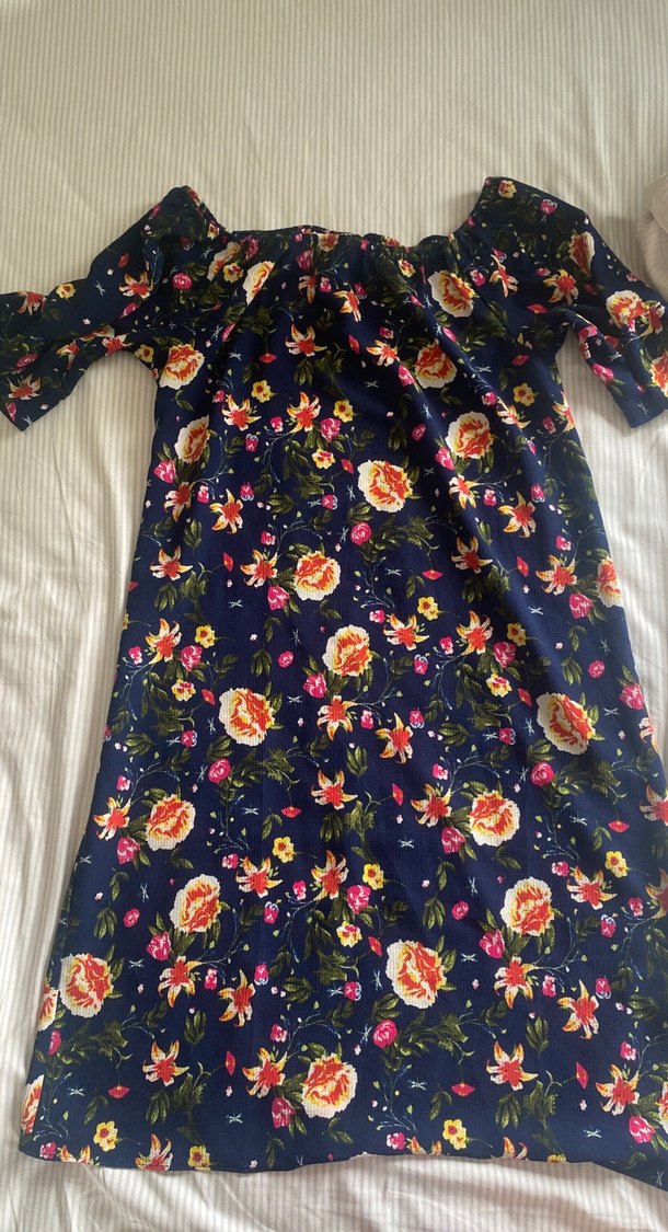 Renkli çiçek desenli, yumuşak sentetik kumaştan uzun bohem elbise. Bol kesim, fırfır detaylı, kayık yaka ve kısa kolludur. Romantik akşamlar için uygun.
