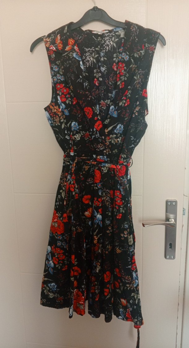 Kolsuz, V yakalı ve kemerli bu bohem elbise, çok renkli koyu çiçek desenine sahip yumuşak sentetik kumaştan yapılmıştır. Günlük kullanım için uygundur. ceplidir. kol altında kolay giyinmek için gizli fermuarı vardır.