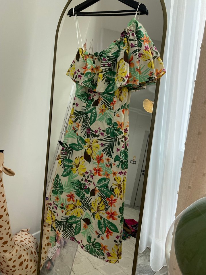 Çiçek desenli, askılı, drapeli kollara sahip uzun bohem elbise. Hafif sentetik kumaştan, günlük kullanım için uygun.