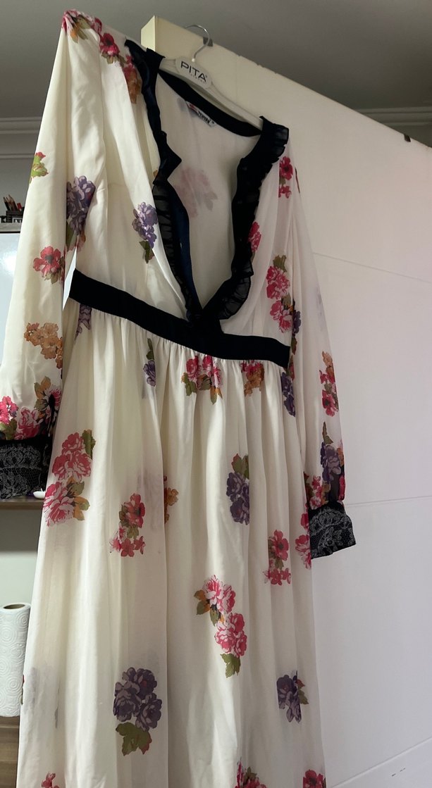 Bohem tarzda, yumuşak kumaştan, çiçek desenli uzun elbise. V yaka, askılı kollu ve fırfır detaylı, rahat kesim günlük kullanım için uygun. Elbise düğümelidir hiçbir sorunu yoktur