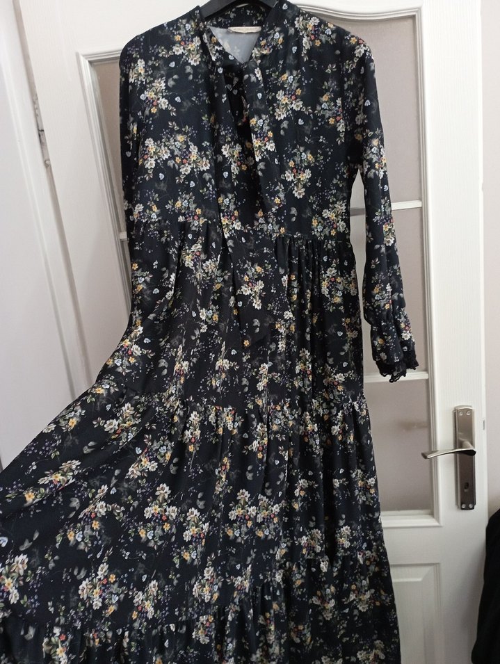 Uzun, koyu renkli çiçek desenli bohem elbise. Fırfırlı, yüksek yakalı ve bol kesimdir. Yumuşak sentetik kumaştan yapılmıştır.kollari dantel detaylı yakası fermuar ve fularli ve etek bölümü astarlı bel oturtmalı etek bölümü geniş rahat uzun elbise, göğüs 50cm,omuz 41 cm,boy 140 cm