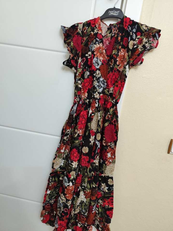 Çiçek desenli, bol kesim uzun elbise, kısa fırfırlı kollar ve V yaka ile yumuşak sentetik kumaştan üretilmiştir.