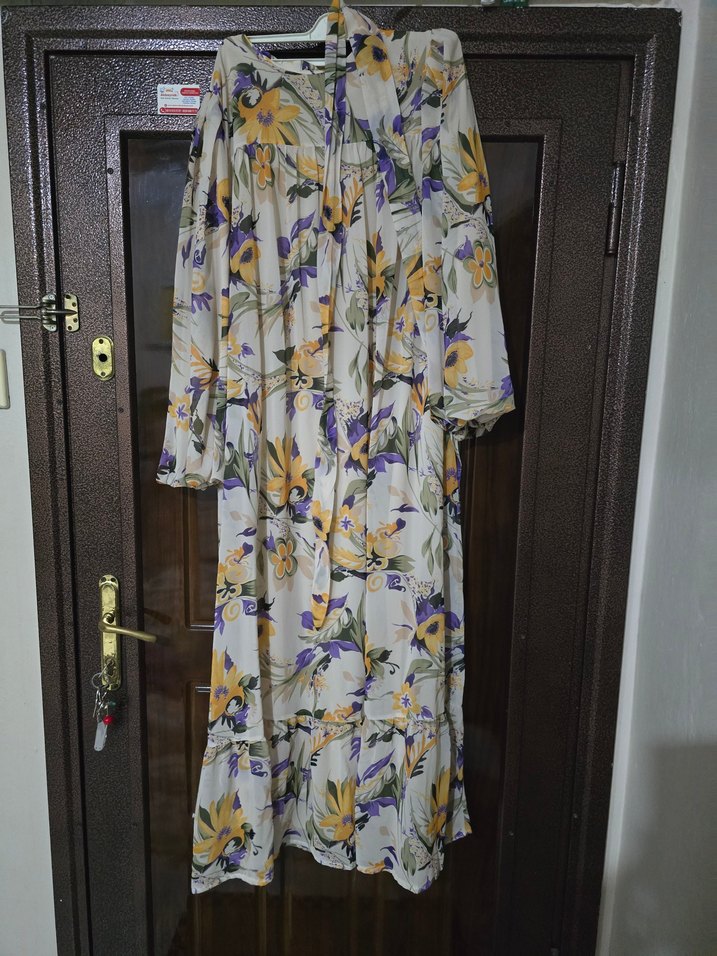 Çiçek desenli, uzun kollu, straplez yakalı, bol kesim bohem elbise. Yumuşak sentetik kumaştan, günlük kullanıma uygun.