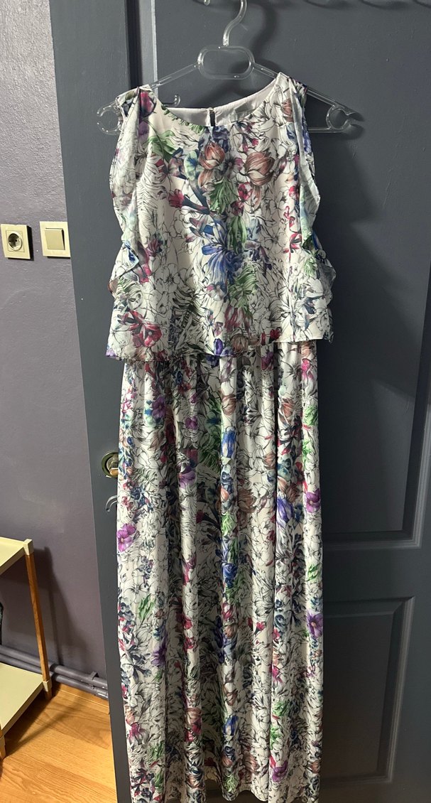 Çiçek desenli, askısız ve kolsuz uzun elbise, bol kesim ve fırfır detaylarına sahip, hafif sentetik kumaştan üretilmiştir. Bohem tarzına uygundur.