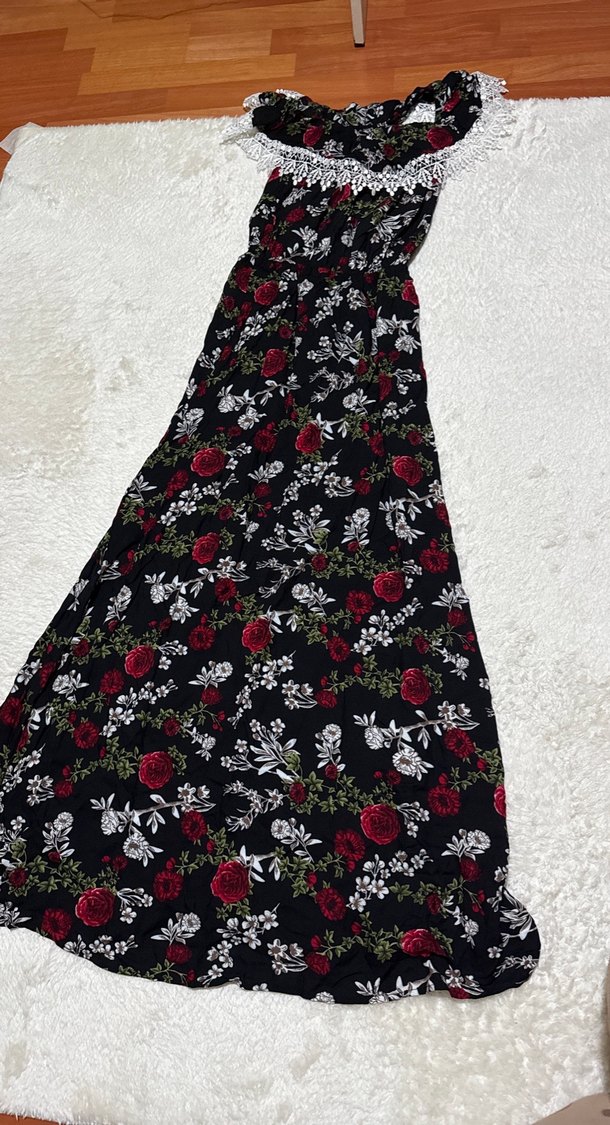 Askılı, straplez uzun elbise, bol kesim ve fırfır detaylı, koyu renk çiçek desenli bohem tarzda.