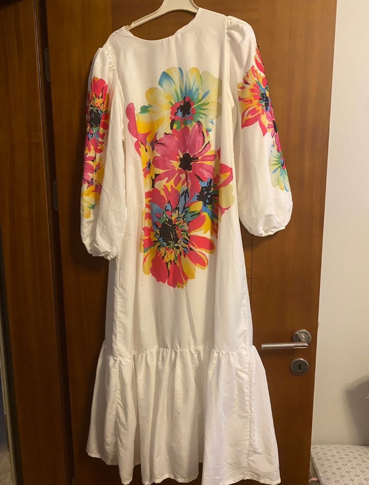 Renkli çiçek desenli, uzun ve bol kesim bohem elbise, uzun kollu, kayık yaka ve fırfır detaylı, yumuşak sentetik kumaştan yapılmıştır. Günlük ve şık kullanılabılıt