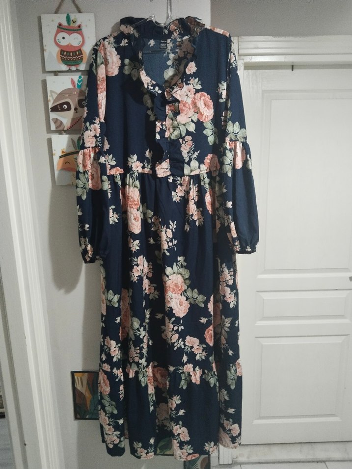 Uzun, bol kesim elbise; koyu renkli çiçek deseni, fırfır detayları, uzun kollu ve yüksek yakalı, yumuşak sentetik kumaştan üretilmiştir.