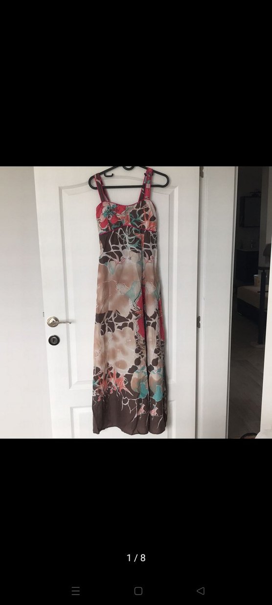 Straplez yakalı, drapeli ve çiçek desenli uzun bohem elbise. çok renkli tie-dye desenli, yüzde yüz pamuklu kumaştan yapılmıştır. askıları düğmeli ve iki kademeli hiç bir kusuru yoktur göğsünde ince petleri vardır iki kol arası 37 cm etiketini kestim kaşındırıyor diye kilo aldığım için satıyorum m yazıyor ama s bedene daha uygun.
