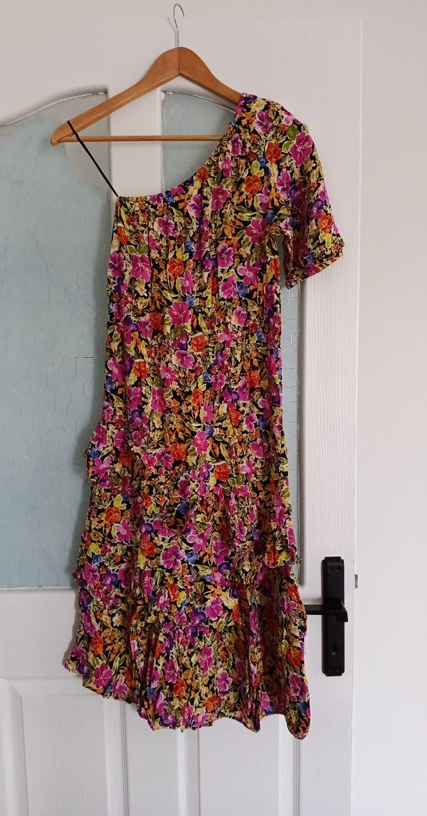Renkli, çiçek desenli bohem elbise; dökümlü, bol kesim, asimetrik straplez ve ince askılı kollara sahip, yumuşak sentetik kumaştan, romantik akşamlar için ideal.
