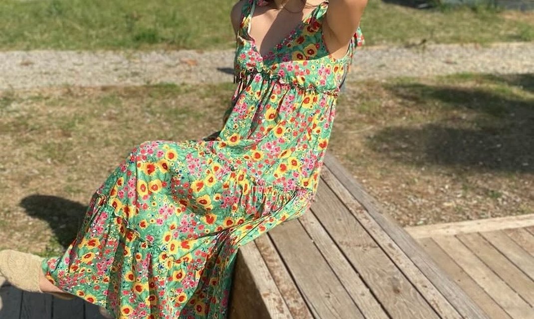Renkli çiçek desenli, salaş kesim ve fırfırlı uzun bohem elbise, dış mekan kullanımı için uygundur.