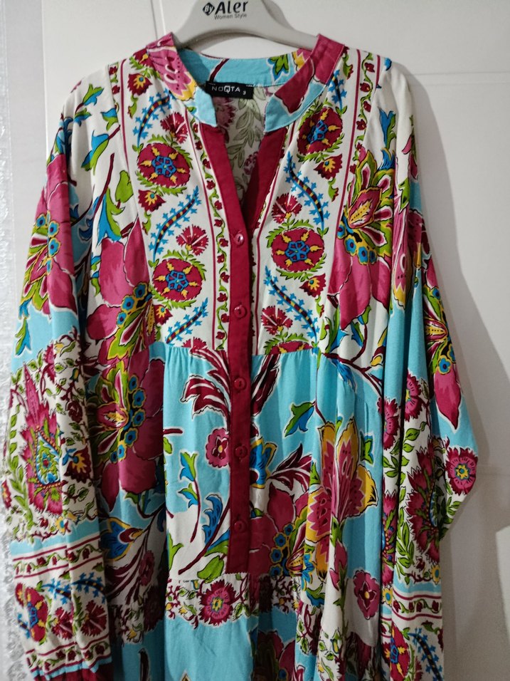 Renkli çiçek desenleriyle uzun, bol kesim, V yaka ve uzun kollu elbise. Ön kısmında düğmeleri vardır, yumuşak kumaştan üretilmiştir. sıfır ayarında bır kaç kez kullandım.boyu uzun olanlar için cok ıdeal vıskon kumas .44_46_48 beden uyumlu