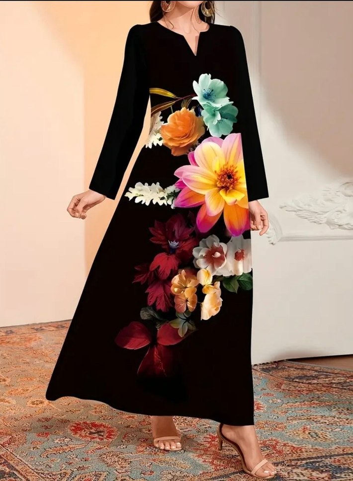 Uzun, bol kesim elbise, V yaka ve uzun kollu, dökümlü tasarıma sahip. Koyu çok renkli çiçek desenli, yumuşak sentetik kumaftan yapılmıştır.
