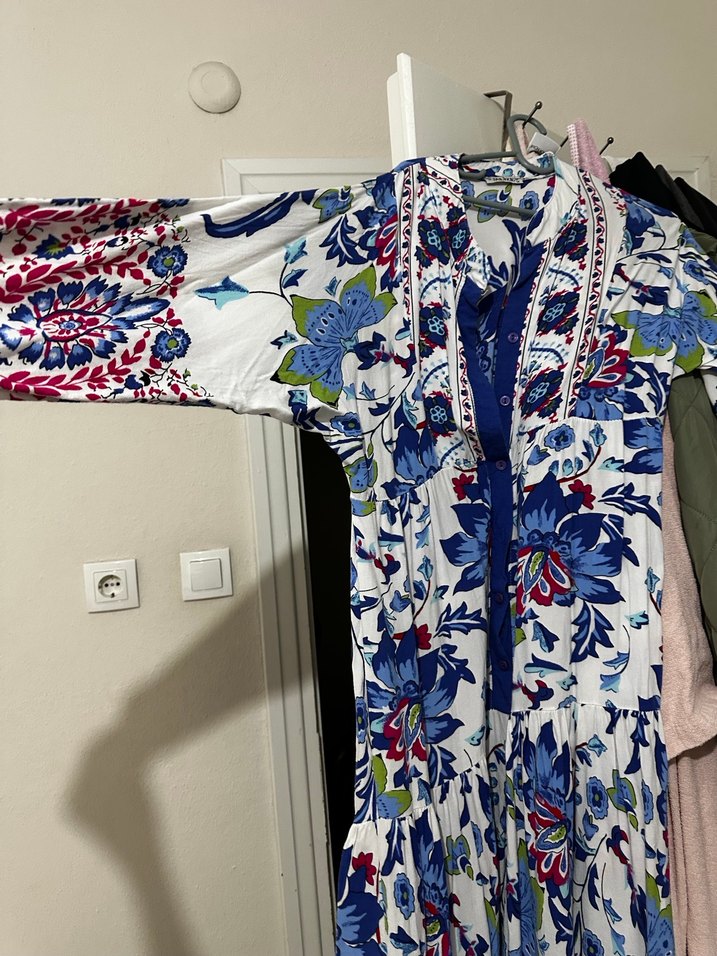 V yaka, düğmeli, bol kesim uzun elbise. Çok renkli canlı çiçek desenleriyle, yumuşak dokulu kumaştan, uzun kollu, günlük kullanım için uygundur.