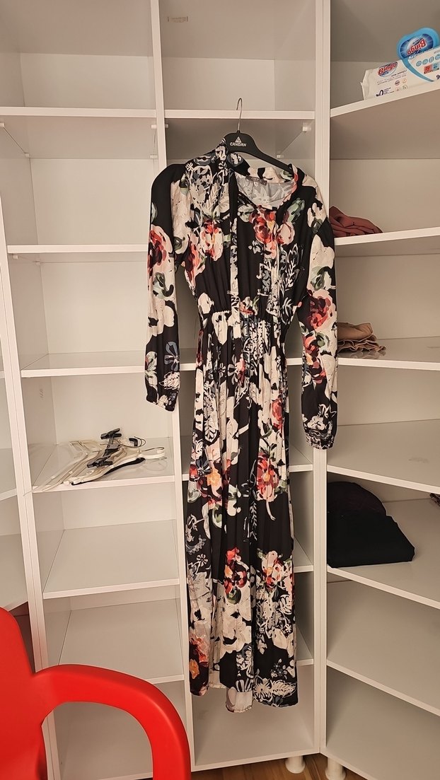 Çiçek desenli, uzun kollu bohem elbise. Yüksek yakalı, kuşaklı ve bol kesimdir. Koyu renkli çok renkli saten kumaştan, günlük kullanıma uygundur.