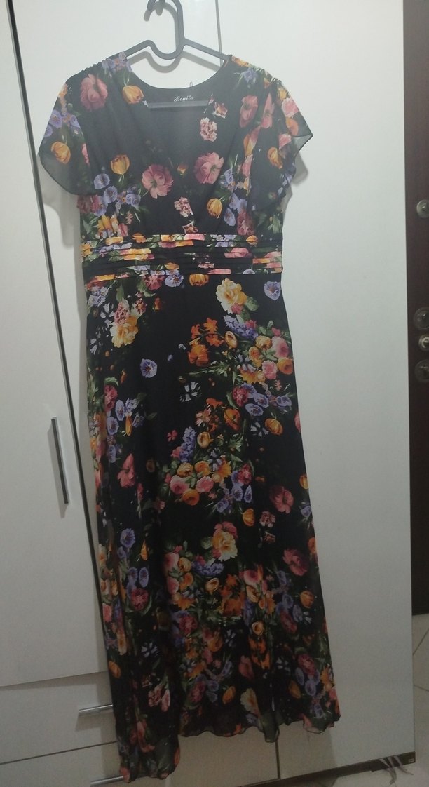 Çiçek desenli, V yakalı ve askılı kollu, drapeli, bohem tarzda dar kesim uzun elbise. Düğünler için uygundur. marka temsilidir