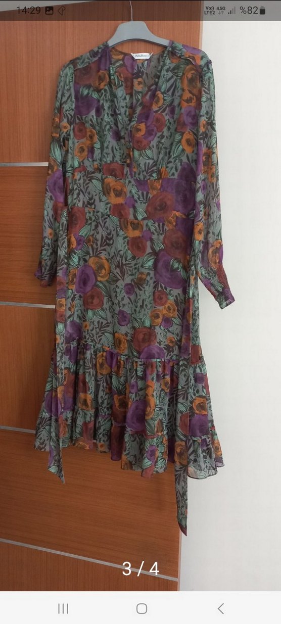 Sentetik kumaştan, uzun kollu ve volan detaylı, koyu renkli çok renkli çiçek desenli bol kesim uzun elbise.