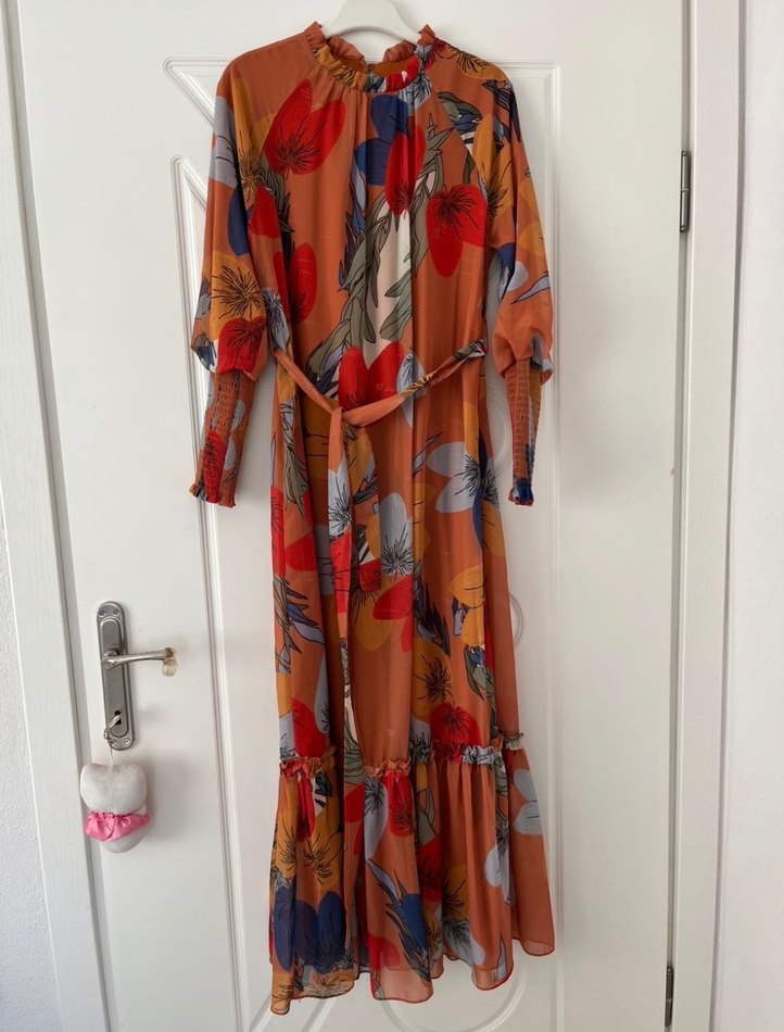 Çiçek desenli, fırfırlı ve yüksek yakalı uzun bohem elbise. Bol kesim ve uzun kollu, günlük kullanıma uygun.