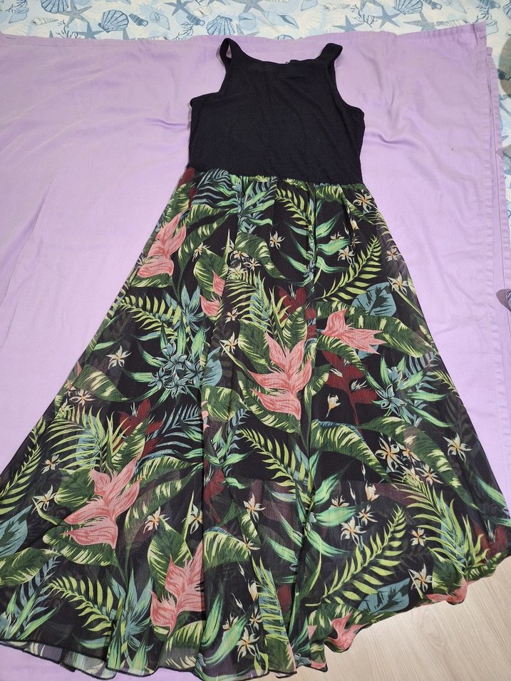 Askılı üst kısmı siyah, çiçek desenli bol etekli, sentetik kumaştan uzun, salaş bohem elbise. Dökümlü kesimiyle dış mekan kullanımı için uygundur.