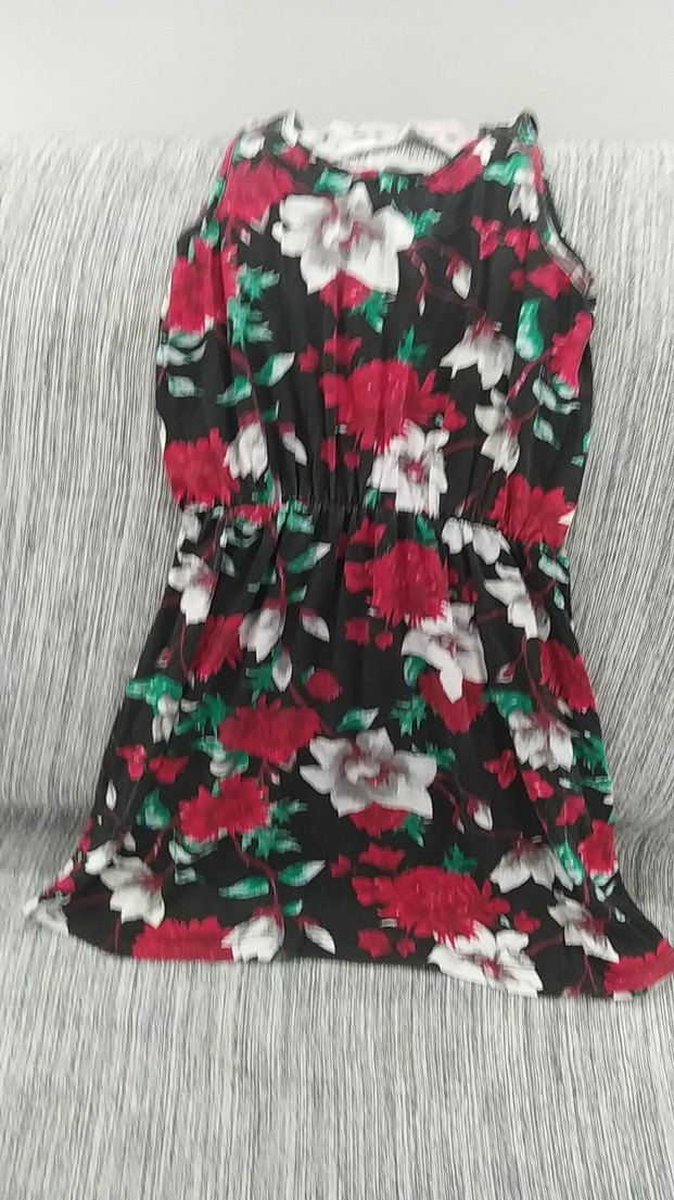 Karanlık çiçek desenli, fırfırlı detaylı kolsuz uzun elbise. Askısız yakalı ve bol kesimli, günlük kullanım için bohem tarzda.