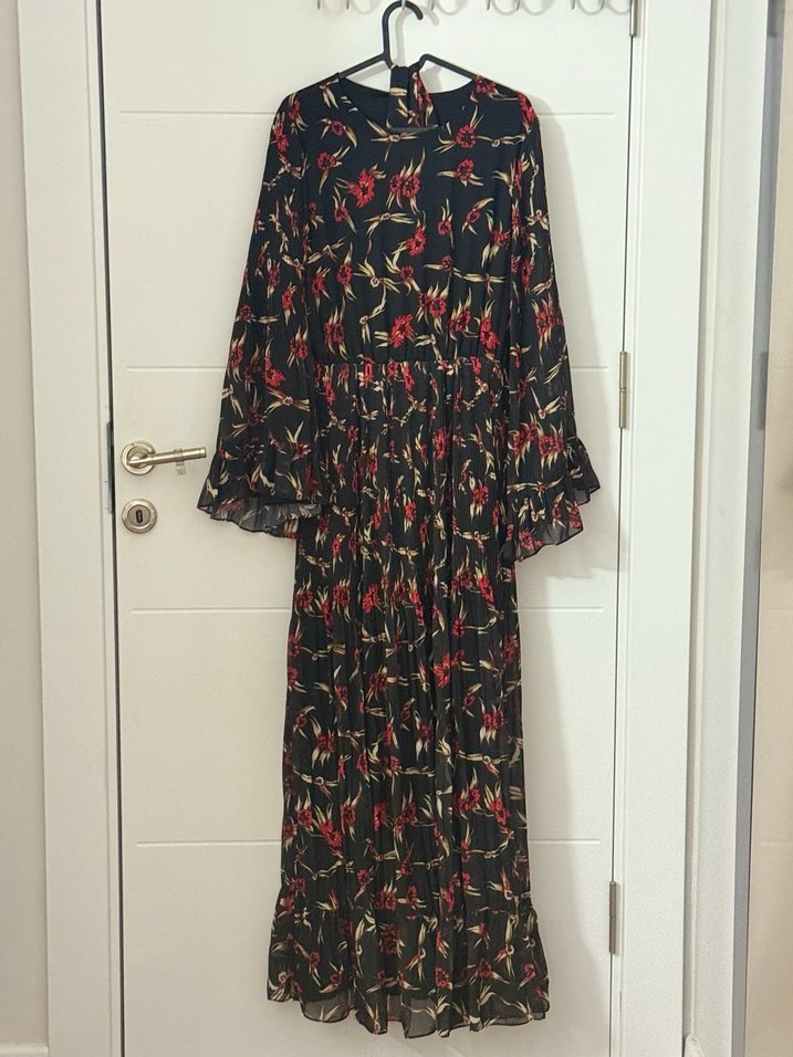 Uzun, bol kesim bohem elbise, pile detaylı ve yüksek yakalıdır. Uzun, volanlı kollara ve koyu renkli çok renkli çiçek desenine sahiptir. Markası accorttur