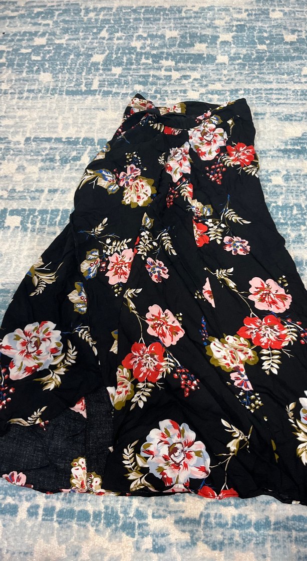 Koyu zemin üzerine çok renkli çiçek desenli, bol kesim ve drapeli uzun etek, yumuşak sentetik kumaştan yapılmıştır.