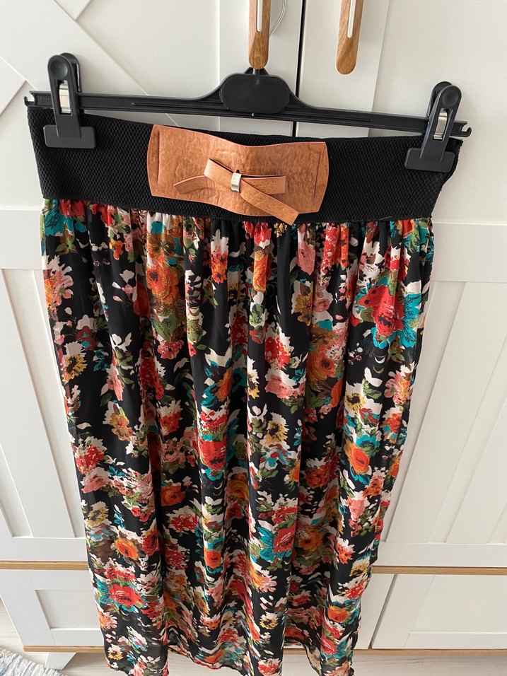Çiçek desenli, bol kesim uzun etek, koyu renkli ve çok renkli deseniyle bel kemeri detayına sahip, yumuşak sentetik kumaştan üretilmiştir.