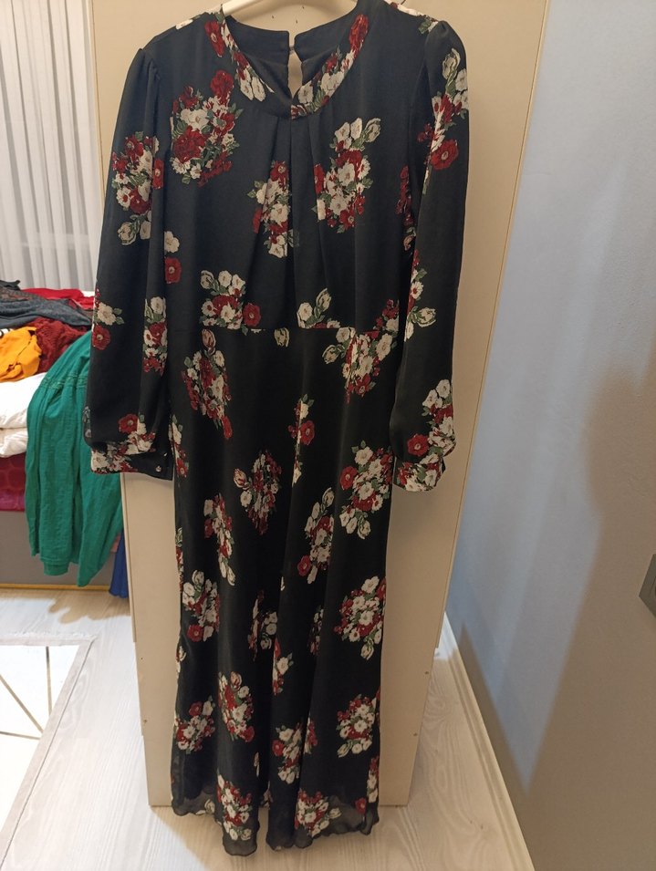 Uzun, bol kesim kadın elbisesi, uzun kollu ve bisiklet yaka detaylıdır. Yumuşak sentetik kumaştan üretilmiş, az kullanıldı bana olmadığı için satıyorum.