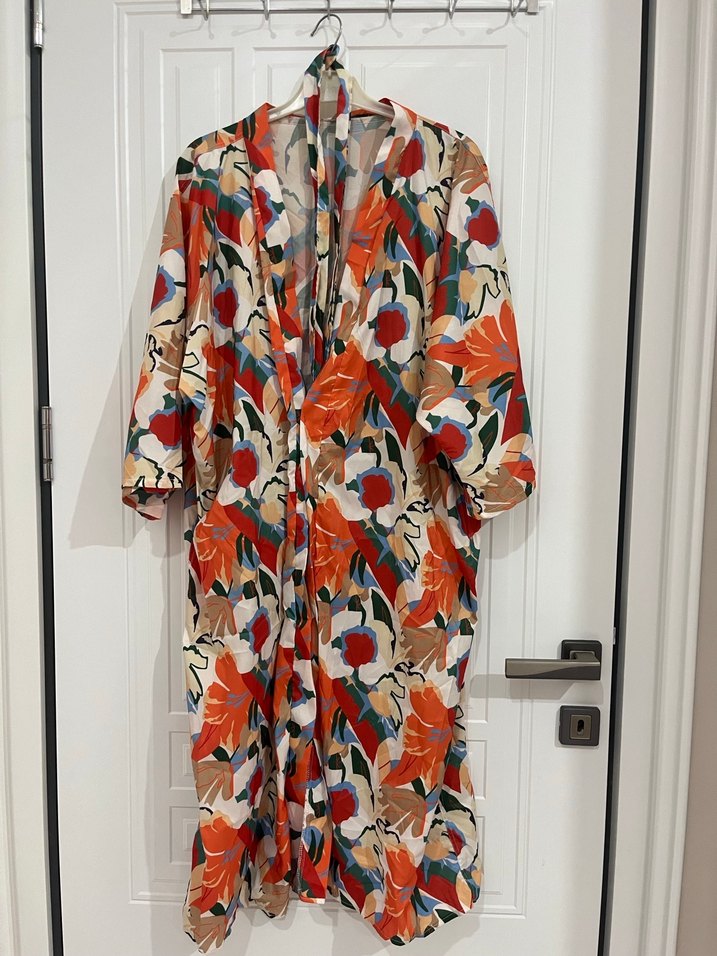 Renkli çiçek desenli, uzun ve bol kesim kadın kimono. Uzun kollu, V yaka ve dökümlü yapısıyla bohem tarzını yansıtıyor. Marka temsilidir 38-46 beden uyumludur