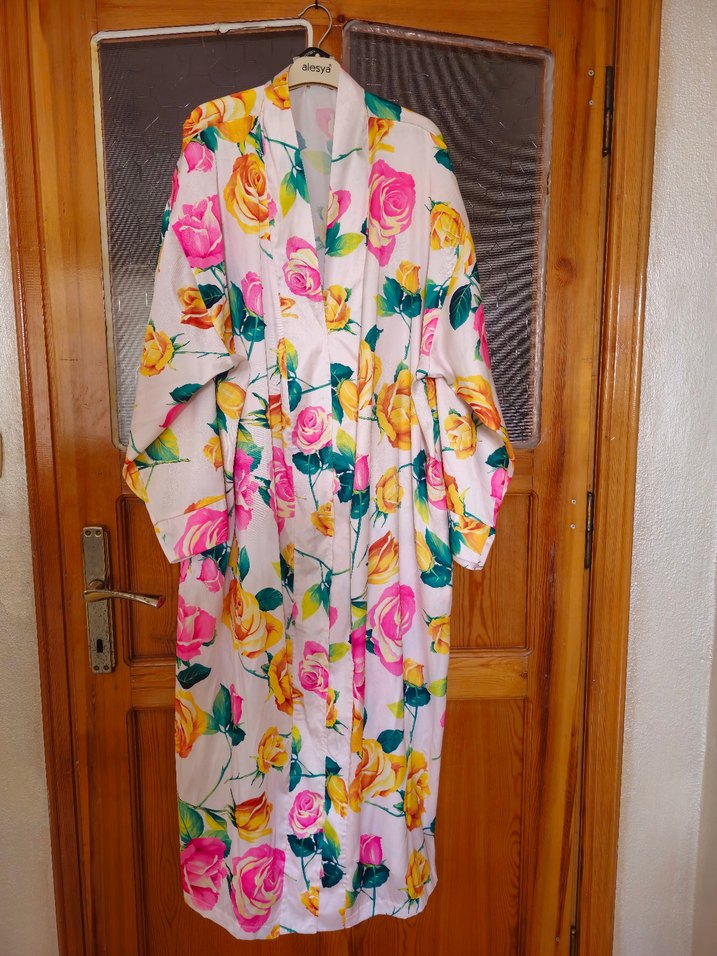 Renkli çiçek desenli, bol kesim ve drapeli uzun kadın kimono. Yumuşak sentetik kumaştan, askılı kollu, bohem tarzda. Namaz elbisesi olarak kullanılmaktaydı.