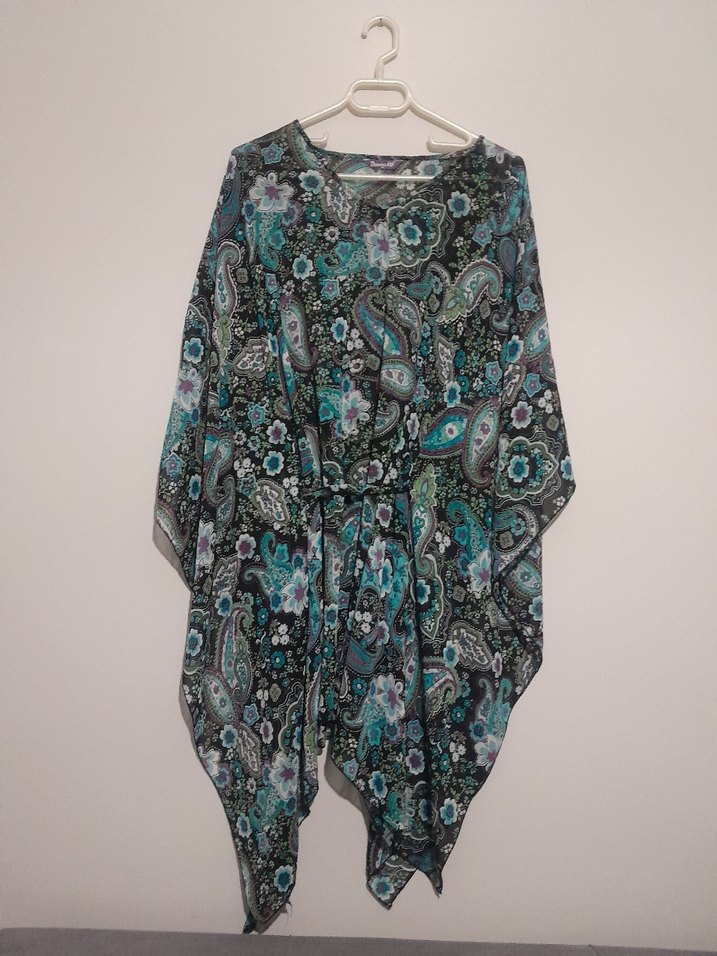 Uzun boy, bol kesim, dökümlü uzun kollu ve bisiklet yaka . Koyu renkli çoklu çiçek desenli batik tarzıyla bohem tarzını yansıtıyor. birkac kez giyilmis pareo yada tunik olarak kullanabilir l bedene de olur