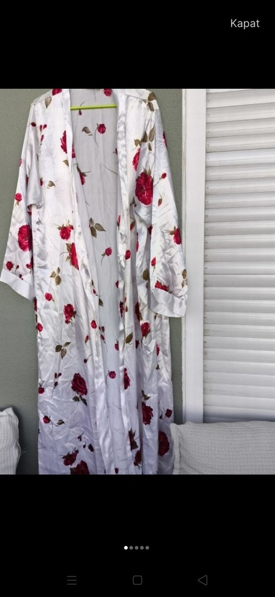 Uzun, bol kesim kadın sabahlığı beyaz zemin üzerine çiçek desenlidir. Bohem tarzda, uzun kollu ve hafif dokuludur.