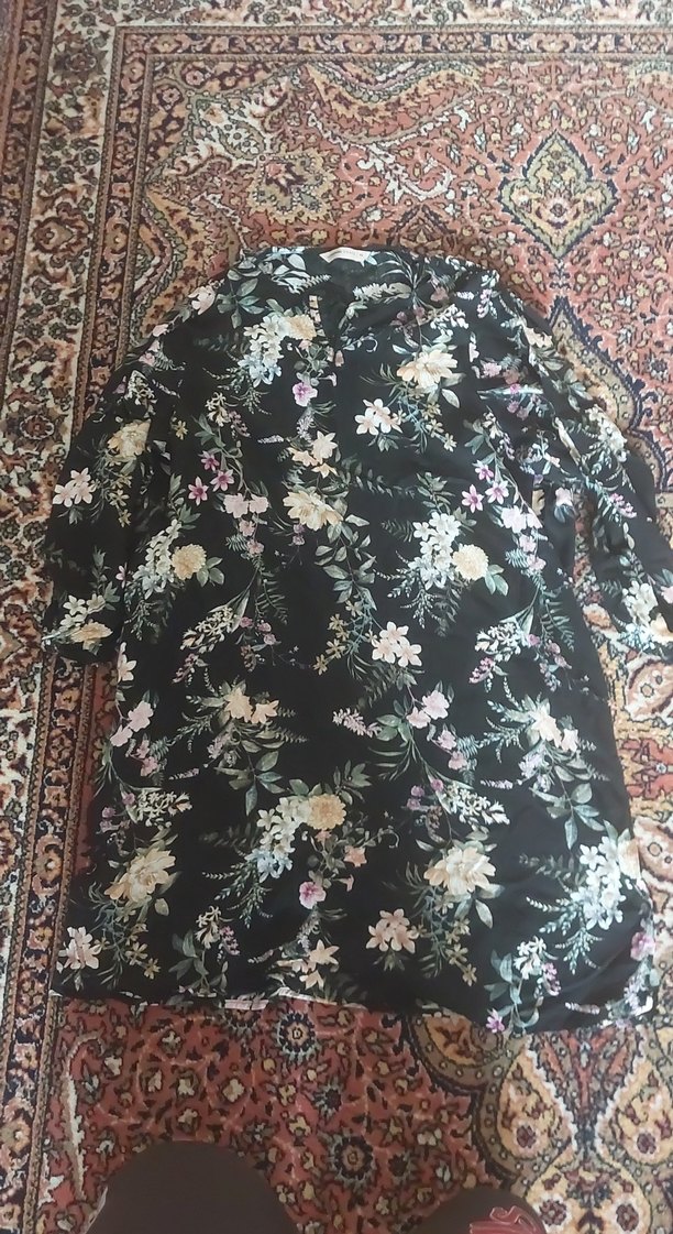 Çiçek desenli, uzun ve bol kesim kadın kimono. Uzun kollu, V yakalı ve yumuşak sentetik kumaştan, günlük kullanıma uygun bohem tarzda.