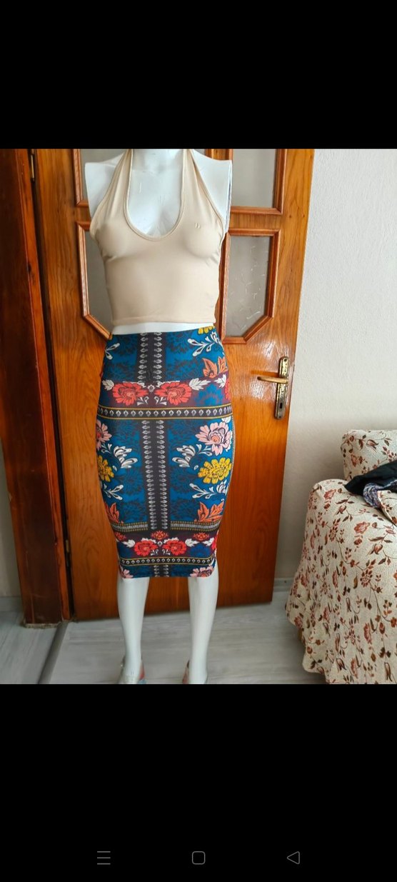 Sentetik kumaştan yapılmış, karanlık çok renkli çiçek desenli, drapeli uzun ve vücuda oturan bohem kalem etek. Günlük kullanıma uygundur boy 65 cm esniyor