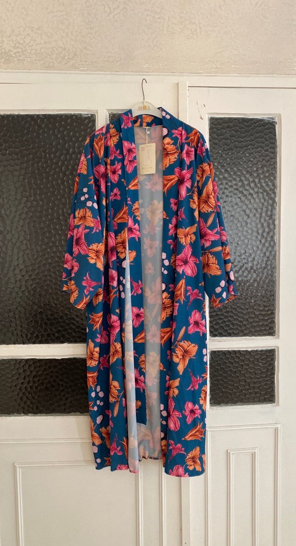 Canlı çiçek desenli, koyu renkli uzun ve bol kesim bohem kimono. Yumuşak sentetik kumaştan, uzun kollu ve dökümlü tasarıma sahip.