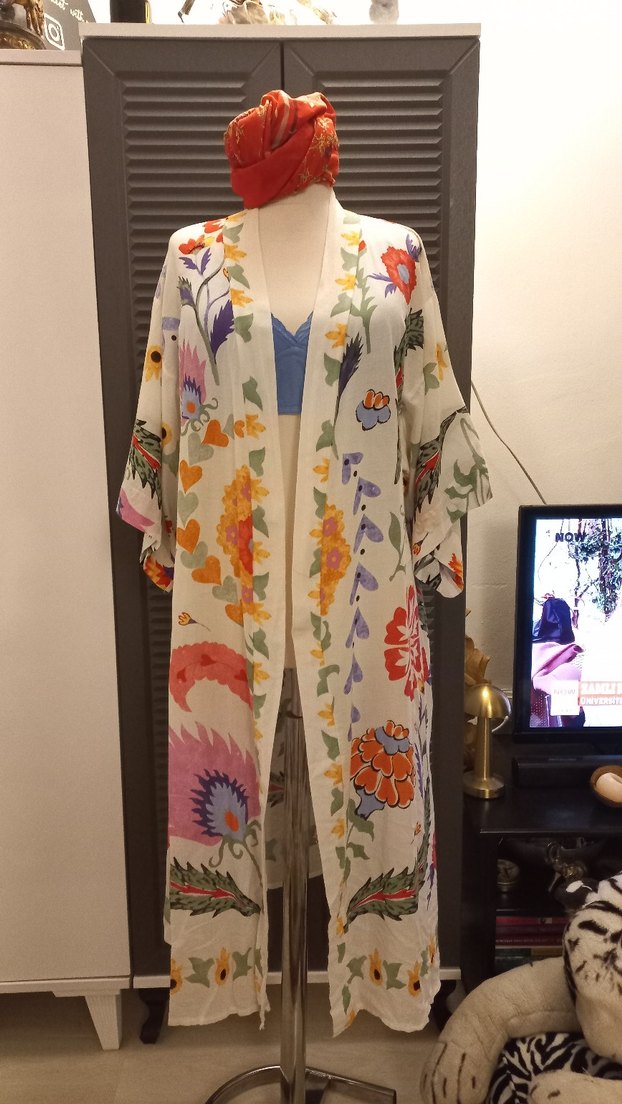 Uzun, bol kesim ve drapeli yapıya sahip bu kimono, uzun kollu ve straplez yakalıdır. Hafif tekstil kumaştan yapılmış, çok renkli canlı çiçek desenleriyle bohem stili yansıtır. plaj için ve günlük hayatınızda kullanabilirsiniz sadece kemeri yok