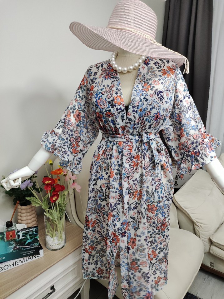 Uzun, bol kesim bohem kimono, askılı kollar ve zarif dantel detaylarla. Hafif renklerde canlı çiçek desenine sahip, günlük kullanıma uygun rahat tekstil kumaş.