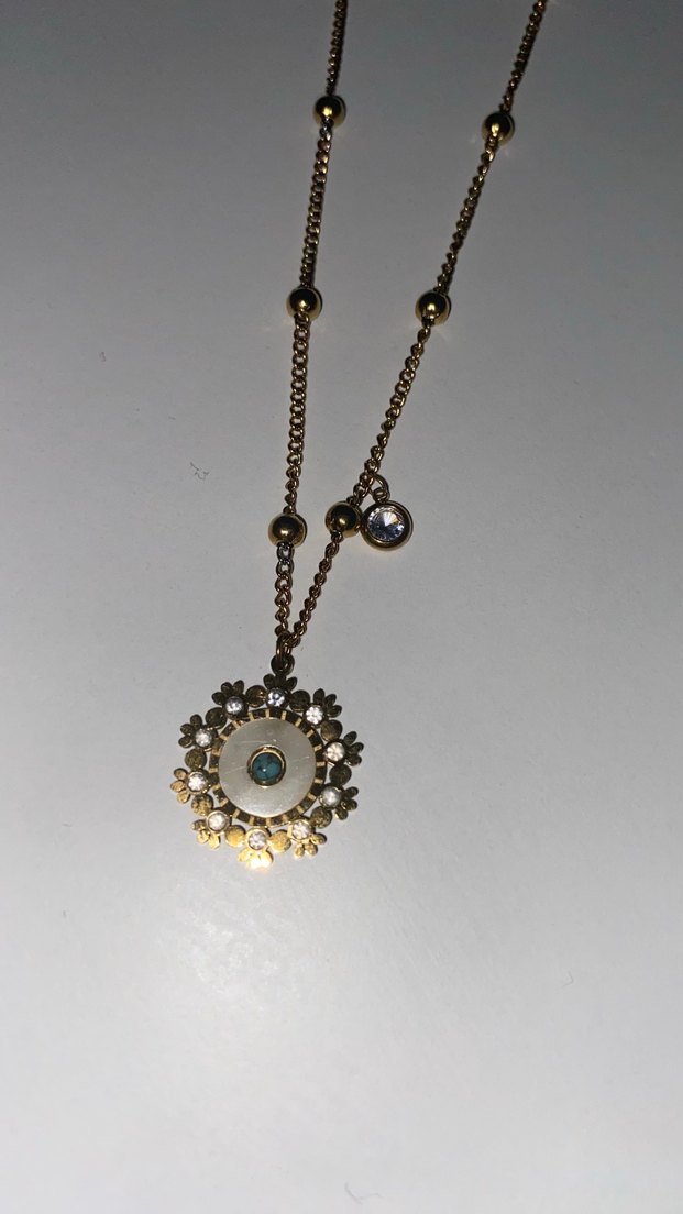 Altın renkli uzun zincir kolye, çiçek desenli detayları ve renkli taşlarıyla bohem tarzını yansıtır. Küçük boncuk detayları ve merkezi süslemeye sahiptir.