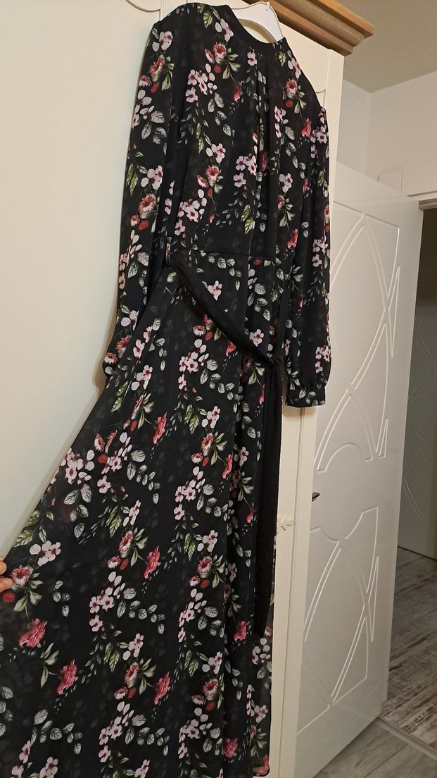 Sentetik kumaştan, koyu renkli çiçek desenli, yüksek yakalı ve askılı kollu, bol kesim uzun drapeli elbise. Ofis için uygun.
