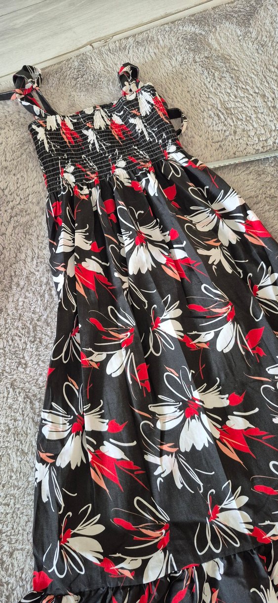 Yumuşak sentetik kumaştan, çiçek desenli ve volanlı uzun elbise Bol kesimli, bohem tarzda günlük kullanım için uygundur. s beden